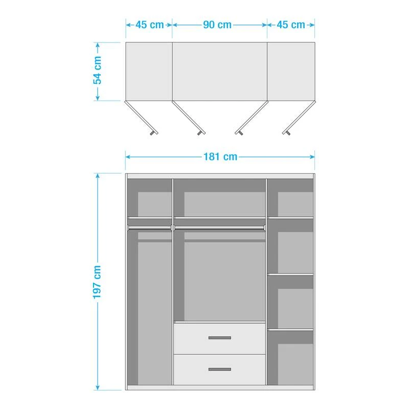- Portes avec miroir et tiroirs avec poignées encastrées