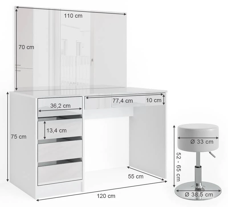 - Contenu de la livraison : • 1x coiffeuse• 1x miroir• 1x tabouret designDécoration non incluse