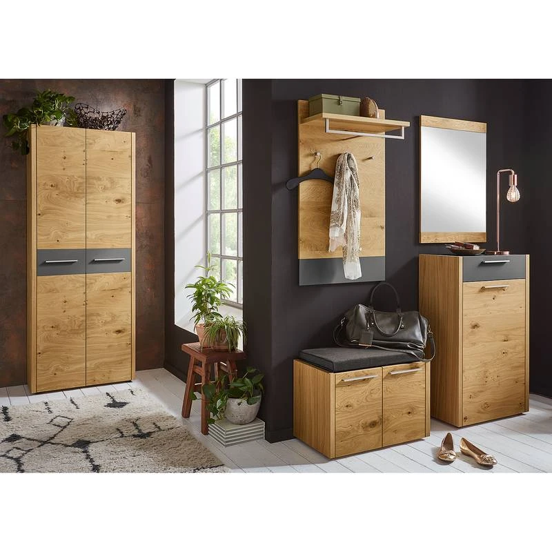 - Contenu de la livraison : Ensemble d’entrée comprenant 1 armoire, 1 porte-manteau mural, 1 banc avec coussin, 1 miroir et 1 meuble à chaussures, sans accessoires