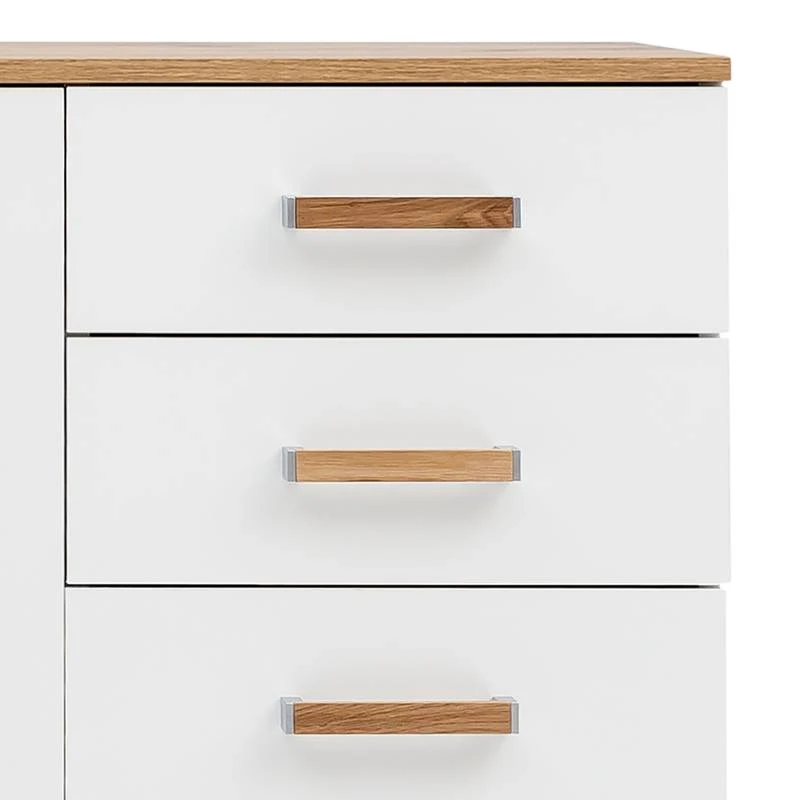 - Poignées et pieds : chêne massif verni